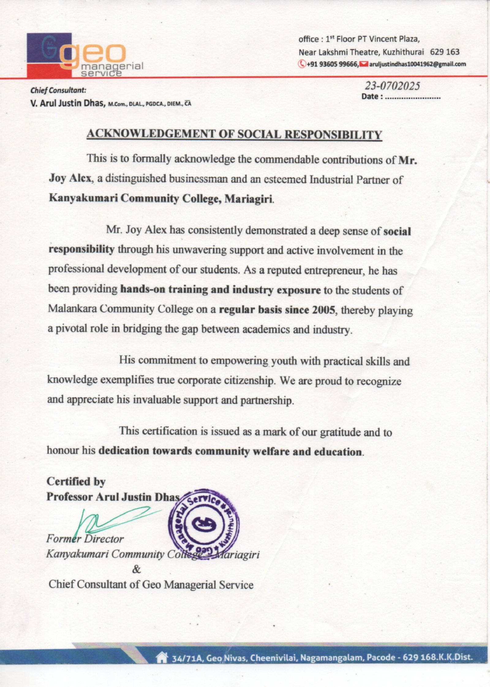 In 1992, I began with a modest dream, two dedicated workers, and a small workshop in Marthandam, Tamil Nadu. There were no detailed plans or significant resources, only unshakable willpower, relentless hard work, and an unwavering determination to grow. Over time, even the impossible began to yield.